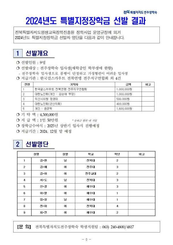 2024년 하반기 특별지정장학금(한국걸스카우트 전북연맹 외 4건) 선발결과 페이지 정보 작성자 관리자 댓글 0건 조회 2,363회 작성일 24-12-20 18:05 본문 목록 이전글 2025년도 입사생 재선발 공고 안내 다음글 2024년 하반기 특별지정장학금(한국걸스카우트 전북연맹 외 4건) 선발안내 댓글목록 댓글목록 등록된 댓글이 없습니다.