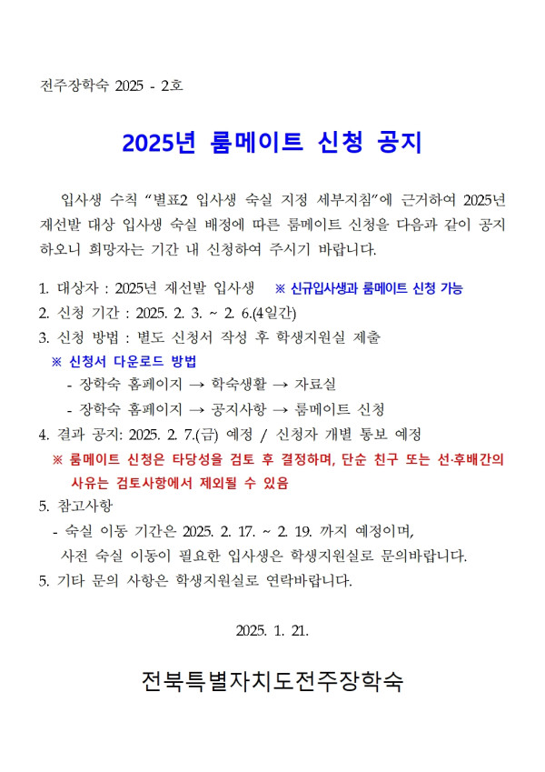 - 장학숙 홈페이지 → 공지사항 → 룸메이트 신청