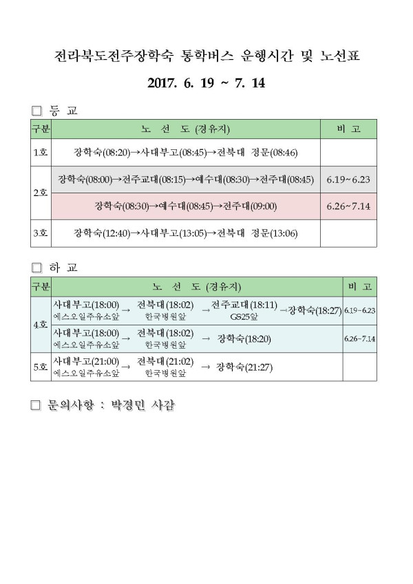 노선과 시간 등을 꼭! 확인하시고 기타 문의사항은 사감실(박경민 사감)로 오시길 바랍니다.