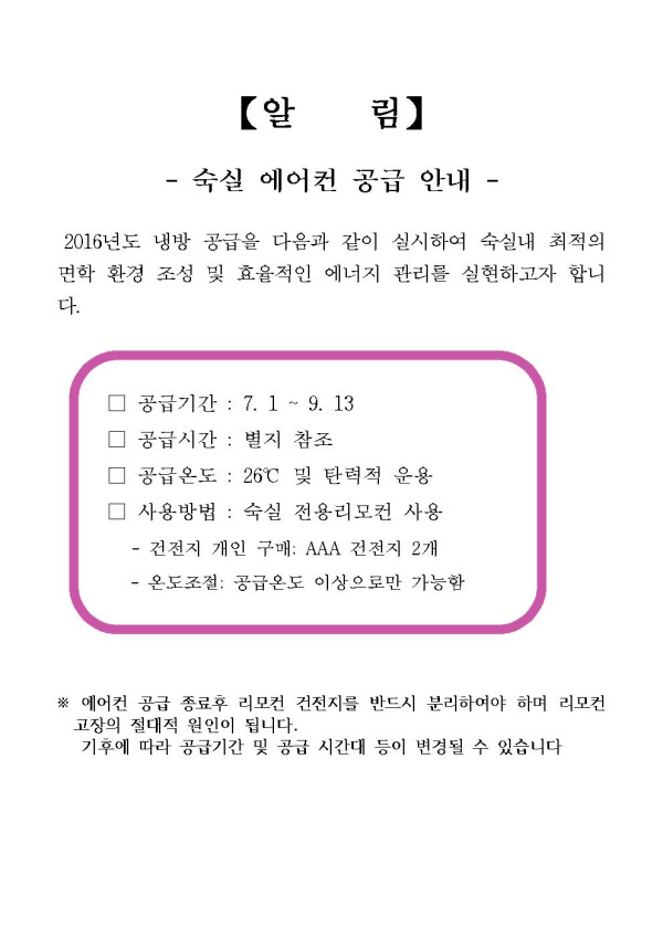 2016 숙실 냉방 공급 안내 페이지 정보 작성자 전주장학숙 댓글 0건 조회 6,210회 작성일 16-06-22 14:28 본문 <?xml:namespace prefix = o /> 첨부파일 냉방 공급 시간표.hwp (801.5K) 185회 다운로드 | DATE : 2016-06-22 14:28:53 목록 이전글 입사생 지문인식기 이용 안내 다음글 방학에 따른 식사시간 변경 안내 댓글목록 댓글목록 등록된 댓글이 없습니다.