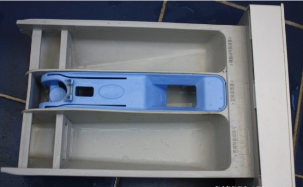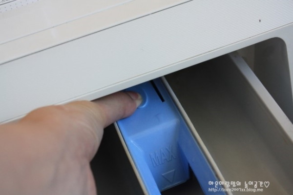 사진1과 같이 파란색 섬유유연제 투입구 안쪽을 누르면 사진2와 같이 빠지게 됩니다.