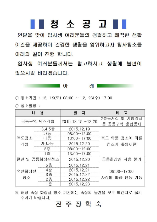 청소 공고 페이지 정보 작성자 전주장학숙 댓글 0건 조회 6,107회 작성일 15-12-18 18:20 본문 연말을 맞아 입사생 여러분들의 청결하고 쾌적한 생활환경 조성을 위한 청소가 아래와 같이 진행됩니다. 입사생 여러분들께서는 참고하시고 생활에 불편이 없으시길 바라며 특히, 화장실 청소시 해당일의 숙실은 숙실 화장실의 물건을 베란다로 옮겨 주시기 바랍니다. 목록 이전글 ♣ 2016년 입사생 재선발 서류 제출 및 안내 다음글 ★ 동계방학 초등 돌봄교실 강사 선정 안내 댓글목록 댓글목록 등록된 댓글이 없습니다.