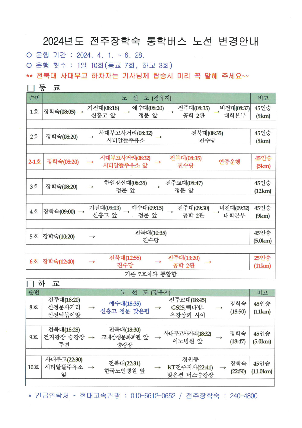 2024년 전주장학숙 통학버스 노선 변경 안내
