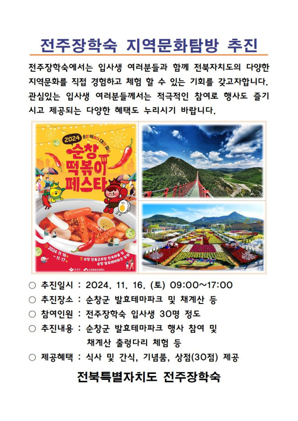 지역문화탐방 추진 공지 페이지 정보 작성자 관리자 댓글 0건 조회 2,493회 작성일 24-11-04 17:49 본문 지역문화탐방 행사가 다음과 같이 진행됩니다.관심있는 입사생분들은 게시판의 게시물을 참조하시고신청명단에 신청하여 주시기 바랍니다. 목록 이전글 총동기회 제14차 정기총회 및 희망장학금 수여식 참석 안내 다음글 11월 소독 및 소방시설점검 안내 댓글목록 댓글목록 등록된 댓글이 없습니다.