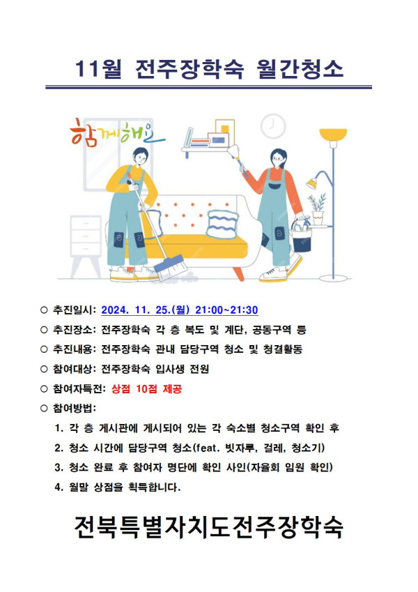 11월 월간청소 시행 페이지 정보 작성자 관리자 댓글 0건 조회 2,392회 작성일 24-11-24 21:03 본문 11월 월간청소가 11월 25일 (월) 21시부터 시행됩니다.입사생 여러분들께서는 적극적인 참여 바랍니다.감사합니다. 목록 이전글 선거관리위원 모집 다음글 연탄나눔 봉사활동 실시 댓글목록 댓글목록 등록된 댓글이 없습니다.