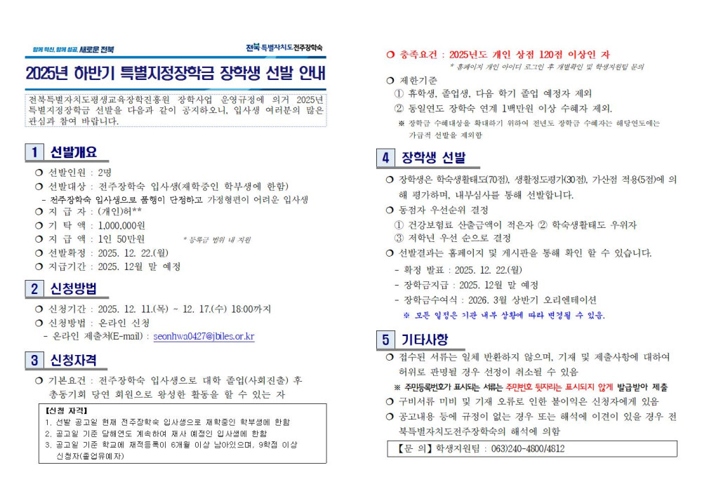 2025년 하반기 특별지정장학금 [(개)허**] 장학생 선발 안내
