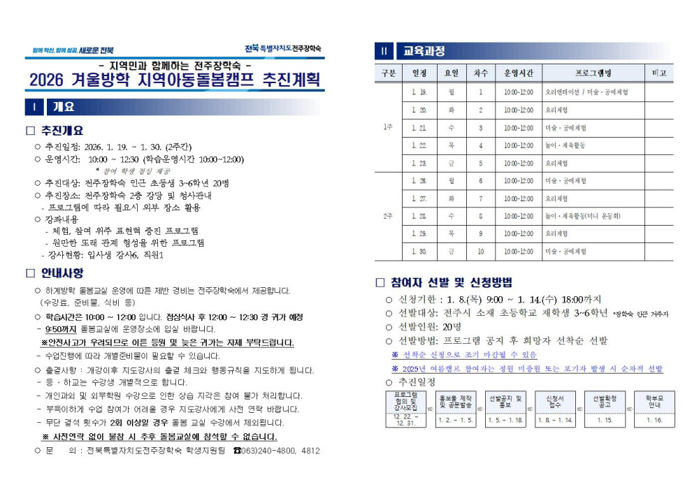 2026년 겨울방학 지역아동돌봄캠프 안내사항 페이지 정보 작성자 관리자 댓글 0건 조회 88회 작성일 26-01-05 09:31 본문 [2026년 겨울방학 지역아동돌봄캠프 안내사항]※ 교육과정 등 세부사항은 첨부파일을 참고해주시기 바랍니다. 목록 다음글 장기 노후 방치 자전거 폐기 안내 댓글목록 댓글목록 등록된 댓글이 없습니다.