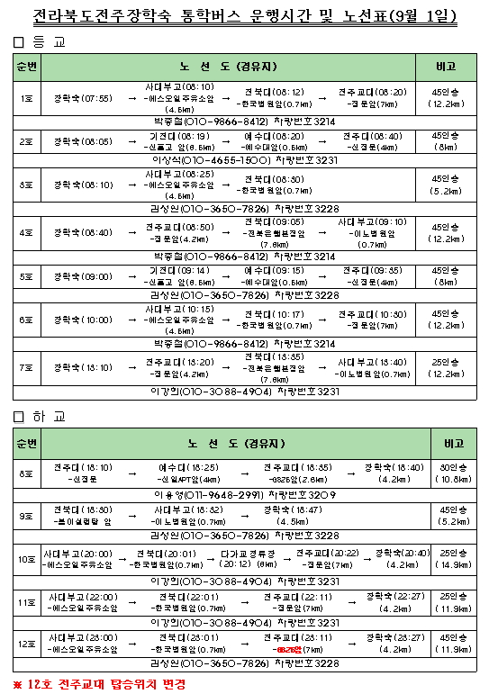 2학기를 맞이하여 통학버스를 아래와 같이 운행하니 참고하시기 바랍니다.