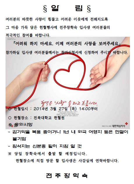 헌혈봉사활동 페이지 정보 작성자 전주장학숙 댓글 0건 조회 5,740회 작성일 14-03-20 21:49 본문 헌혈봉사활동이 아래와 같이 있습니다. 적극적인 참여 바랍니다. 목록 이전글 정기 숙실 점검 다음글 건강진단서 제출 안내 댓글목록 댓글목록 등록된 댓글이 없습니다.