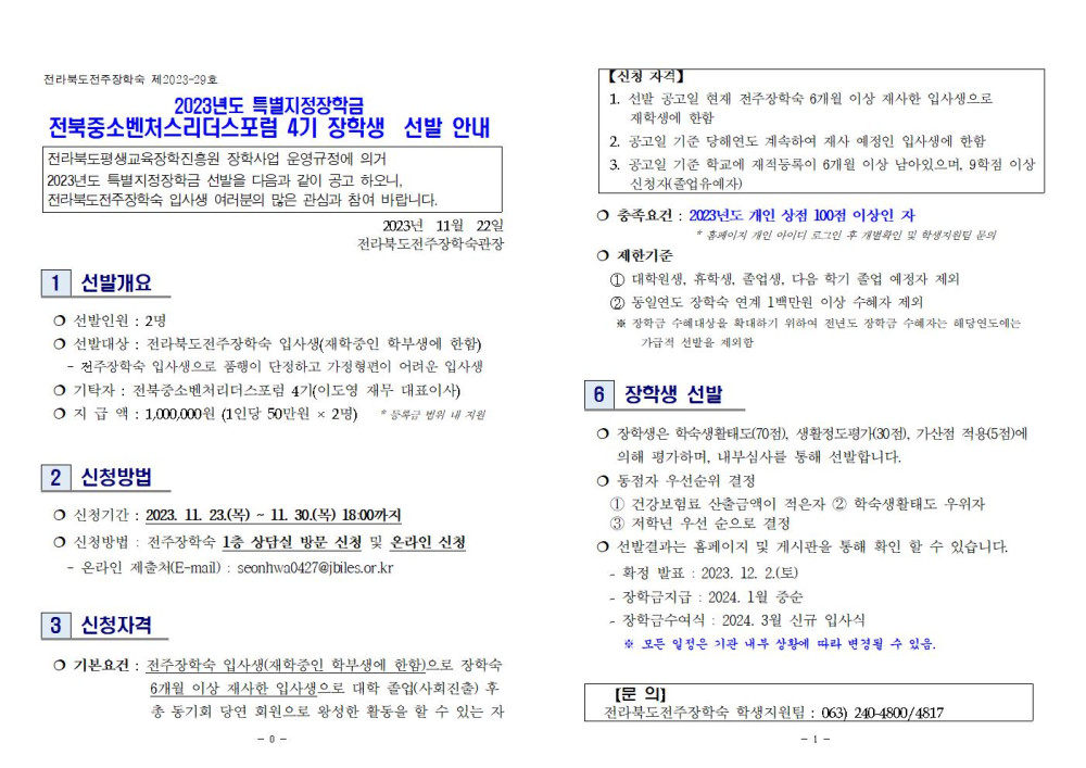 - 2023년 특별지정장학금 전북중소벤처스리더스포럼 4기 장학생 선발안내_공고.hwp (96.0K) 74회 다운로드 | DATE : 2023-11-22 10:08:27