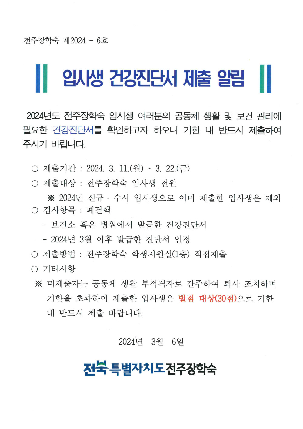 2024년 입사생 건강진단서 제출 알림 페이지 정보 작성자 관리자 댓글 0건 조회 4,520회 작성일 24-03-06 10:14 본문 목록 이전글 전주장학숙 재사생 오리엔테이션 공지 다음글 2024년 신규입사생 입사식 공지 댓글목록 댓글목록 등록된 댓글이 없습니다.