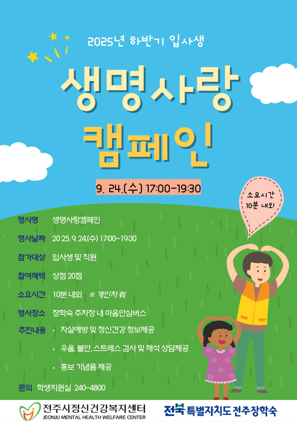 2025년 하반기 정신건강프로그램[생명사랑캠페인] 페이지 정보 작성자 관리자 댓글 0건 조회 1,254회 작성일 25-09-03 09:04 본문 2025년 하반기 정신건강프로그램[생명사랑캠페인] 목록 이전글 2025년 2학기 통학버스 운행노선(수정) 다음글 전주장학숙 2학기 입사생 오리엔테이션 안내(9.10) 댓글목록 댓글목록 등록된 댓글이 없습니다.
