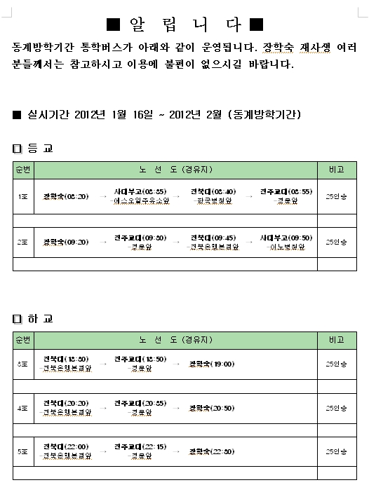 노선 및 시간은 아래 첨부파일과 같으니 확인하시고