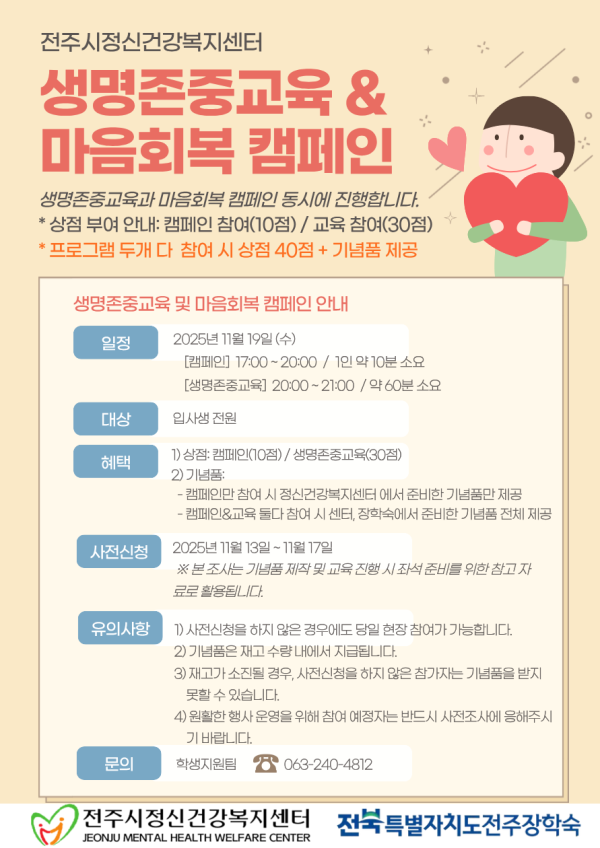 2025년 하반기 생명존중교육 및 마음회복 캠페인[전주시정신건강복지센터] 페이지 정보 작성자 관리자 댓글 0건 조회 45회 작성일 25-11-13 10:15 본문 생명존중교육과 마음회복 캠페인 동시에 진행합니다. 자세한사항은 포스터를 참고해주세요. 목록 다음글 2025년 11월 숙실점검 알림 댓글목록 댓글목록 등록된 댓글이 없습니다.