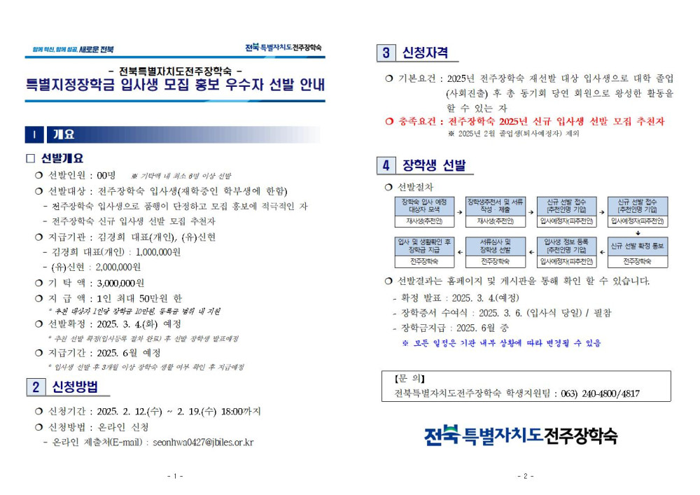 - 01.2025 특별지정장학금 입사생 모집 홍보 우수자 선발 안내문.hwp (576.0K) 84회 다운로드 | DATE : 2025-02-07 22:51:00