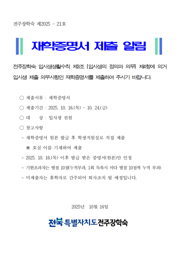 재학증명서 제출 알림 페이지 정보 작성자 관리자 댓글 0건 조회 256회 작성일 25-10-16 10:15 본문 재학증명서 제출 알림 목록 이전글 11월 소독안내 다음글 2025 대학(원)생 지역발전 정책제안 발표대회 안내 댓글목록 댓글목록 등록된 댓글이 없습니다.