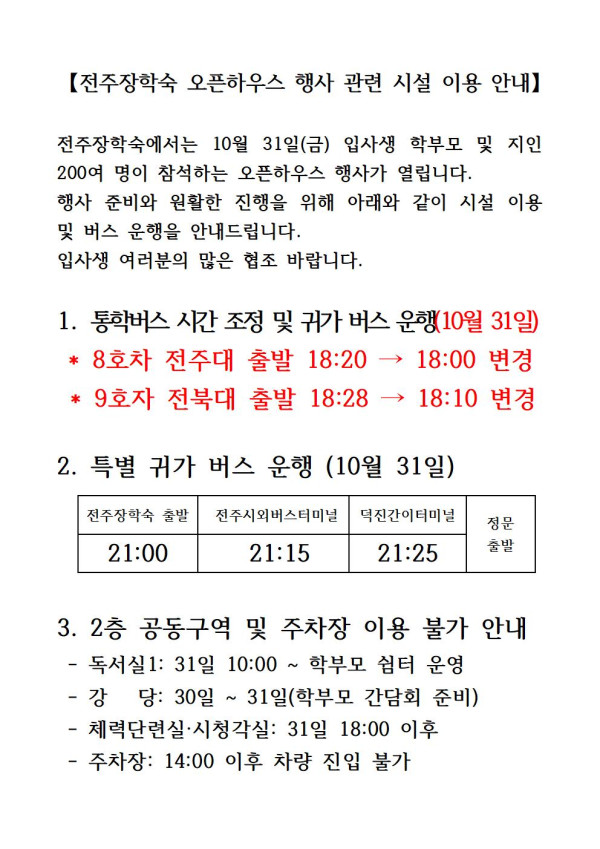 오픈하우스 행사 관련 시설이용안내(통학버스) 페이지 정보 작성자 관리자 댓글 0건 조회 263회 작성일 25-10-24 18:53 본문 ☎ 문의(학생지원실) 240-4800 목록 이전글 2025년 하반기 입사생 교양강좌 알림 다음글 10월 31일 전주장학숙 오픈하우스 입사생 참여 안내. 댓글목록 댓글목록 등록된 댓글이 없습니다.