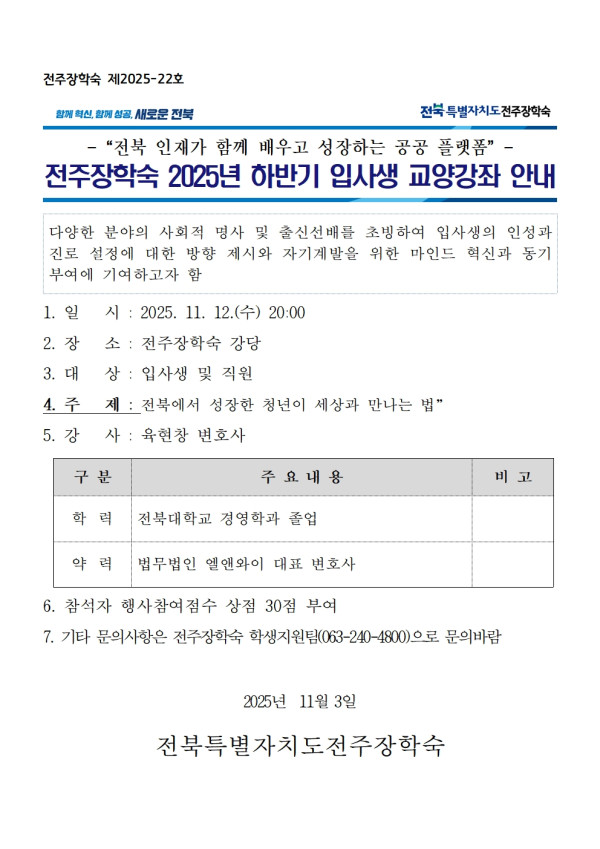 2025년 하반기 입사생 교양강좌 알림 페이지 정보 작성자 관리자 댓글 0건 조회 121회 작성일 25-11-05 08:48 본문 목록 이전글 * 소방종합점검 일자 조정안내 다음글 오픈하우스 행사 관련 시설이용안내(통학버스) 댓글목록 댓글목록 등록된 댓글이 없습니다.