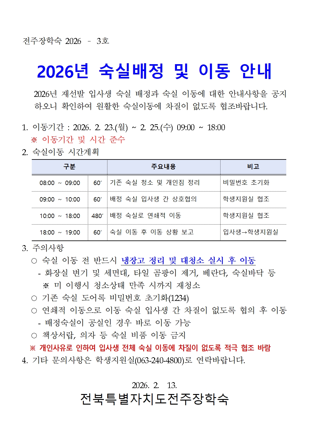 2026년 숙실배정 및 이동 안내