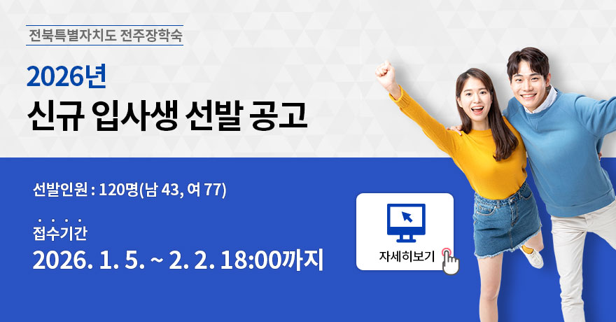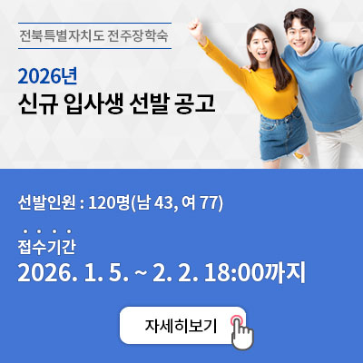 2026년 전북특별자치도전주장학숙 입사생 선발요강을 다음과 같이 공고합니다. 1. 선발인원 : 120명(남 43, 여 77)2. 자격기준 : 붙임 모집요강 참조3. 접수기 . . .