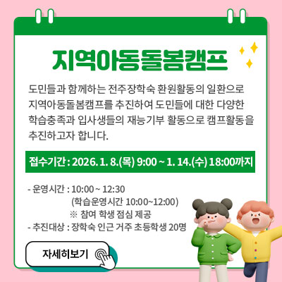[2026년 겨울방학 지역아동돌봄캠프 안내사항]※ 교육과정 등 세부사항은 첨부파일을 참고해주시기 바랍니다.